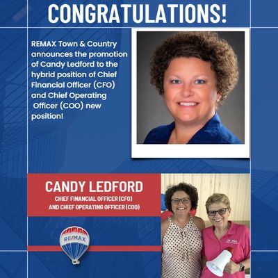 Canton Oct 1– REMAX Town & Country is thrilled to announce the well-deserved promotion of Candy Ledford to the unique and challenging hybrid position of Chief Financial Officer (CFO) and Chief Operating Officer (COO). This promotion recognizes Candy's exceptional dedication, leadership, and consistent contributions to the company over the last four years.